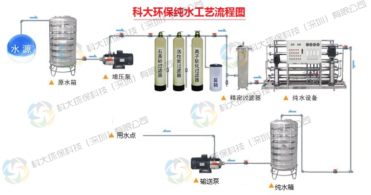 源水箱→源水增壓泵→多介質(zhì)過濾器→活性碳過濾器→陽樹脂軟化器→精密過濾器→一級RO反滲透純水系統(tǒng)→二級RO反滲透純水系統(tǒng)→水氣混合器→臭氧殺菌機→不銹鋼純水罐→恒壓輸送系統(tǒng)→用水點